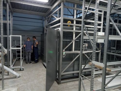 Подъемник установлен в металлокаркасной шахте. Его грузоподъемность составляет 1000 кг, а высота подъема - 4 м.